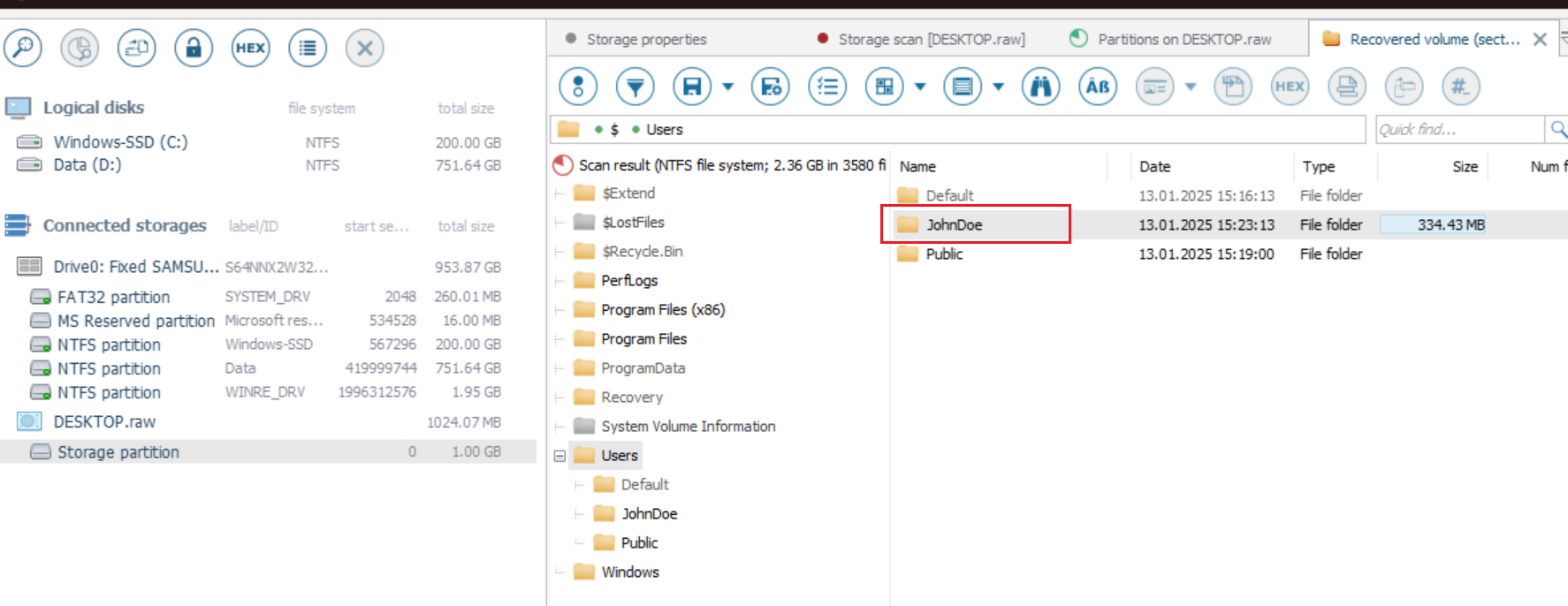 使用ufs打开可以查看到用户名为JohnDoe,同时能够发现桌面上存在exe文件