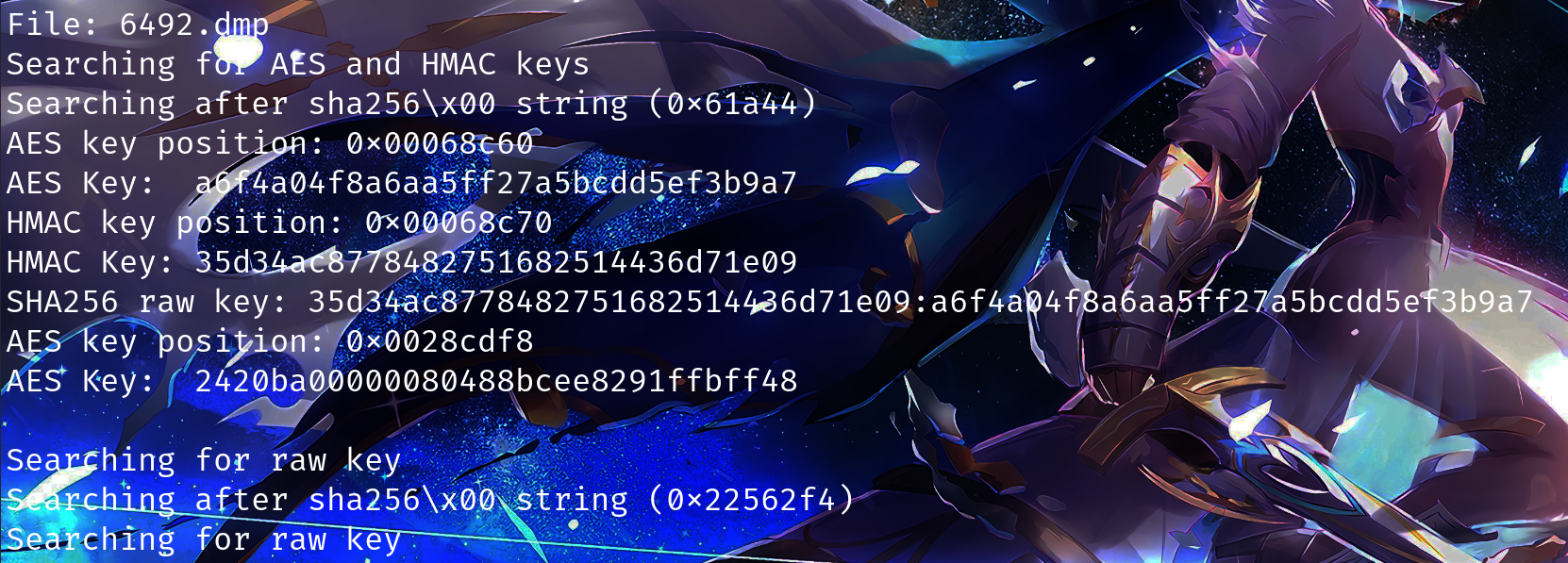 先使用vol2 -f DESKTOP.raw --profile=Win10x64_19041 memdump -p 6492 -D ./将对应Beacon进程dump下来,然后使用Beta/cs-extract-key.py来提取密钥