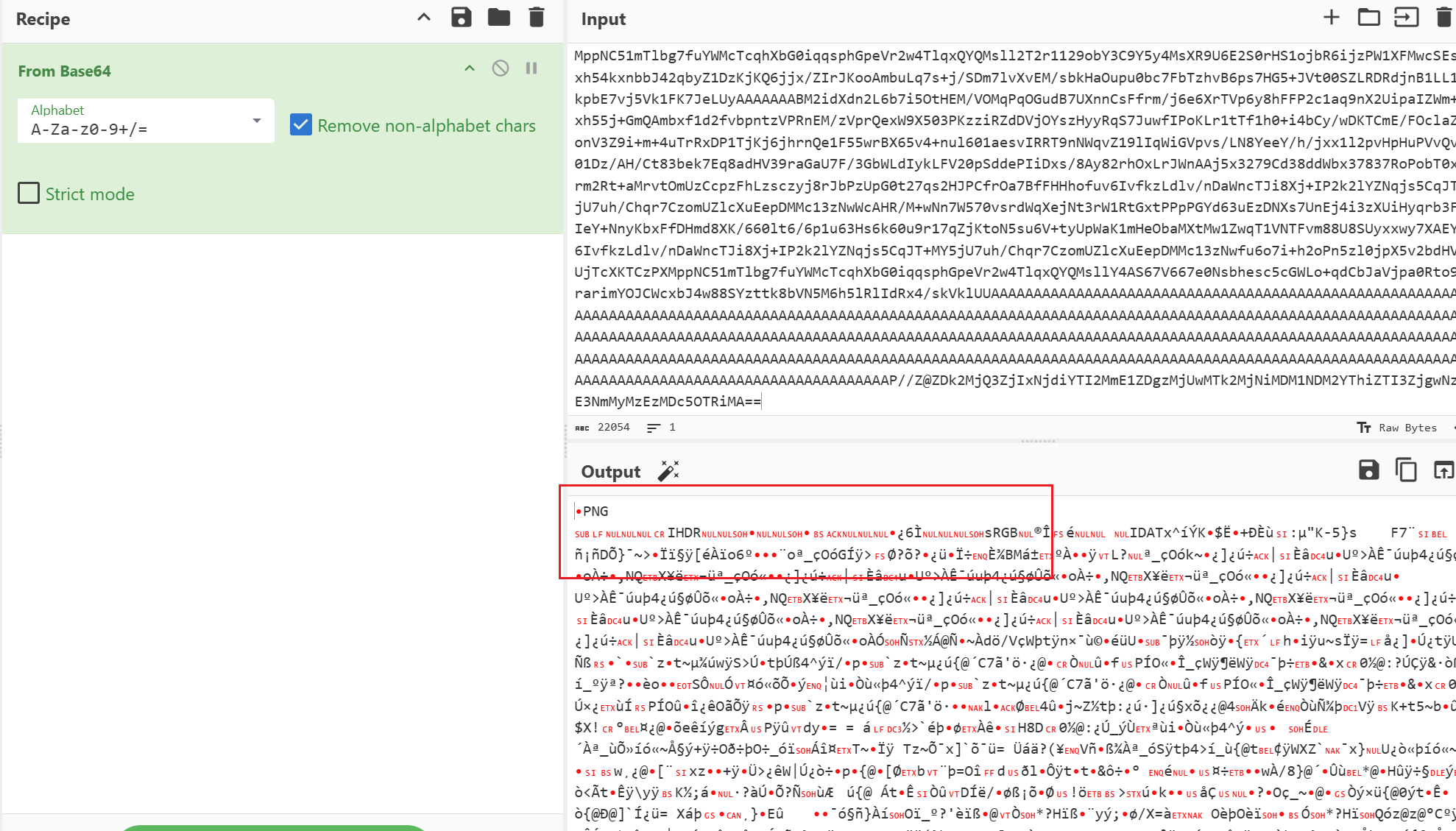 题目首先给出了一个 text.txt 文件,查看过后发现是 BASE64 编码后的结果,先进行 BASE64 的解码,发现开头字符为 PNG 图片的数据开头格式。