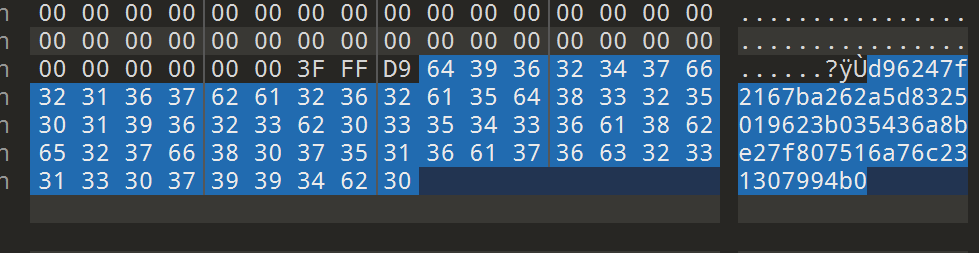 接着使用 010 Editor 打开该图片,往下翻找发现 JPG 的文件格式,并且在文件末尾找到一个字符串d96247f2167ba262a5d8325019623b035436a8be27f807516a76c231307994b0