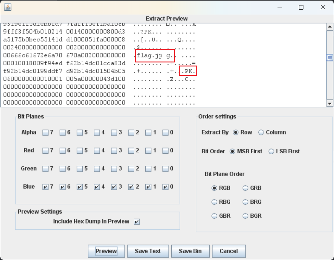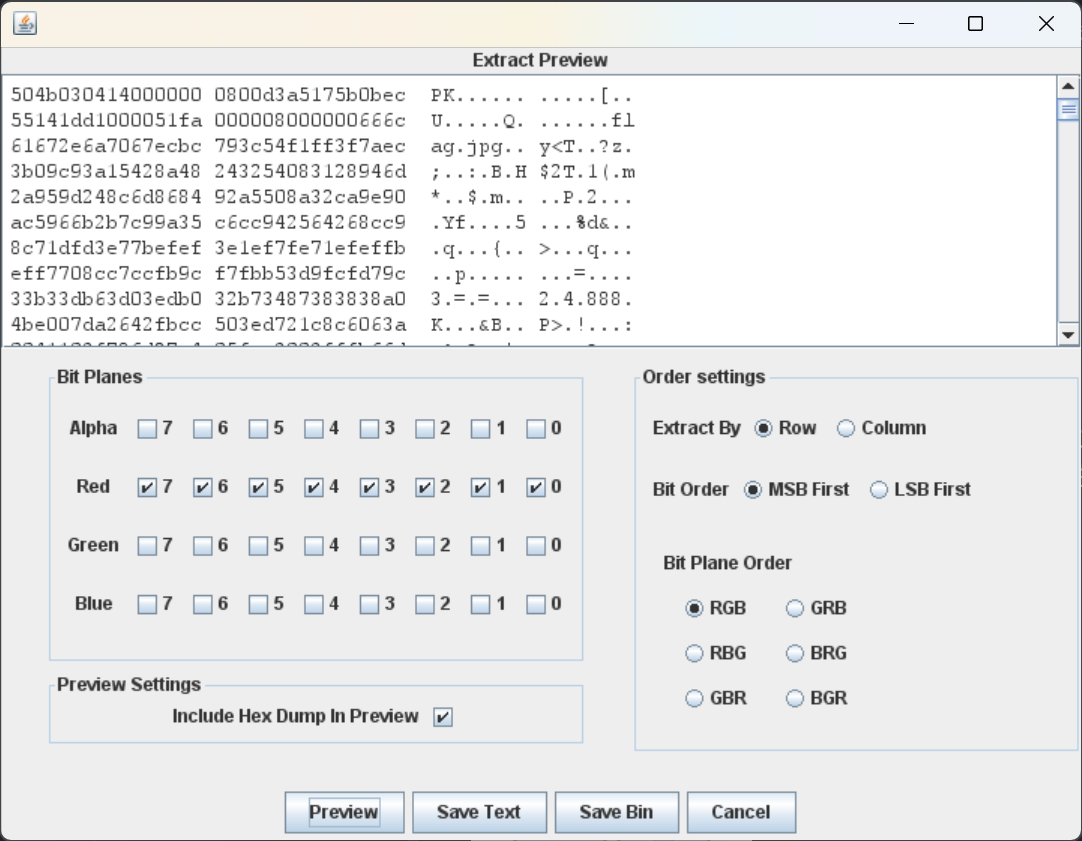 然后使用 Data Extract 对通道上的数据进行分析,勾选 Red 的所有通道,查看十六进制数据,发现是 Zip 的数据,但是并不完整,因此猜测后边的每个图片是否都带有一部分数据