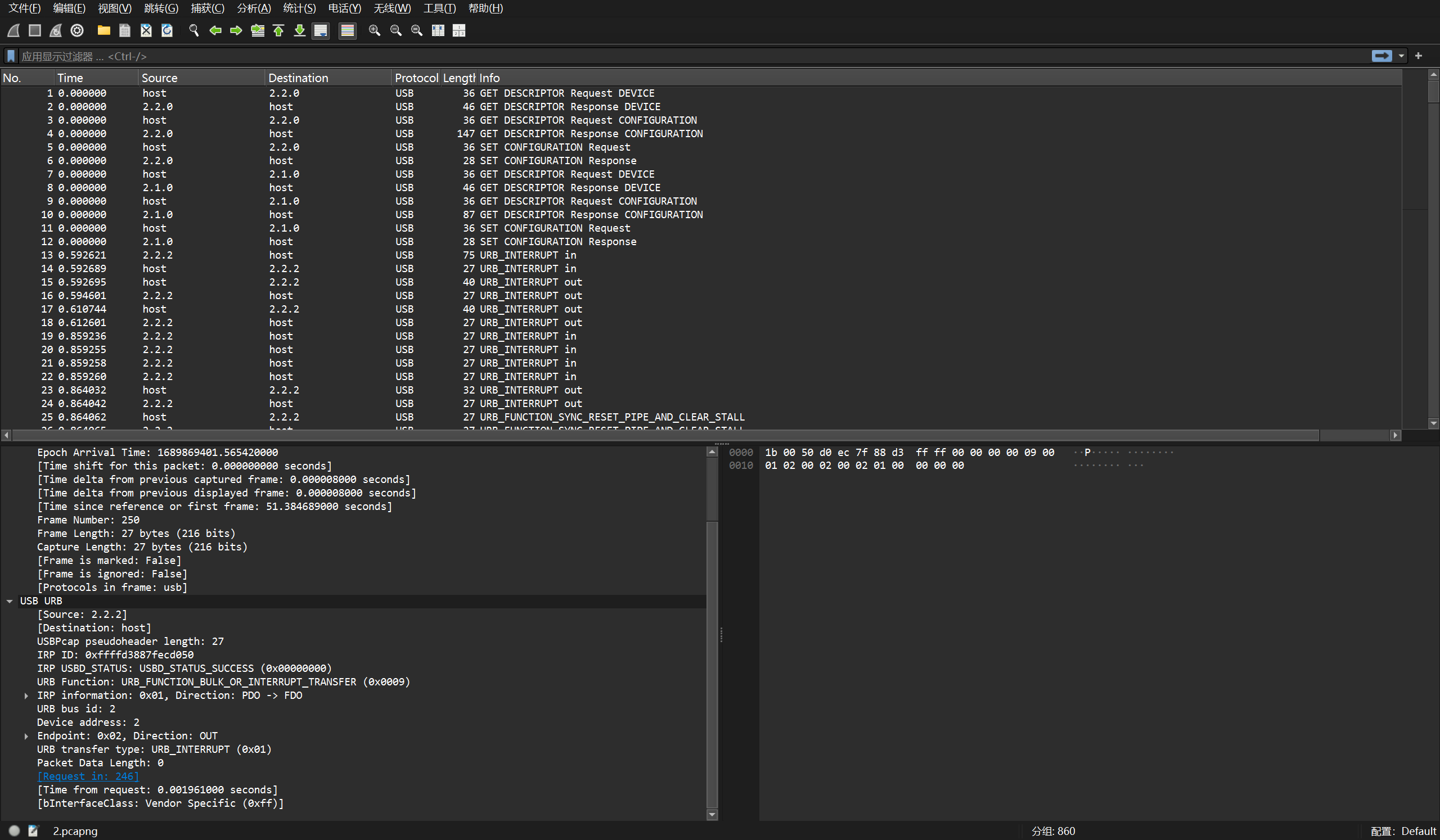 附件中给出了一个 1.pcapng 的流量数据包,使用 Wireshark 打开查看发现是 USB 流量,猜测是否会是鼠标流量或者键盘流量。